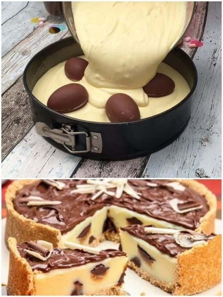 Dieser cremige Käsekuchen mit Schokoladenstückchen ist ein echtes Highlight! Der knusprige Keksboden aus Butterkeksen wird mit einer Mischung aus Quark, Crème fraîche und Puddingpulver kombiniert. Schokoriegel sorgen für eine süße Überraschung im Teig. Nach dem Backen ruht der Kuchen eine Stunde im ausgeschalteten Ofen, bevor er vollständig abkühlt. Das Ergebnis: ein himmlisch zarter Käsekuchen mit schokoladigem Genuss in jedem Bissen!